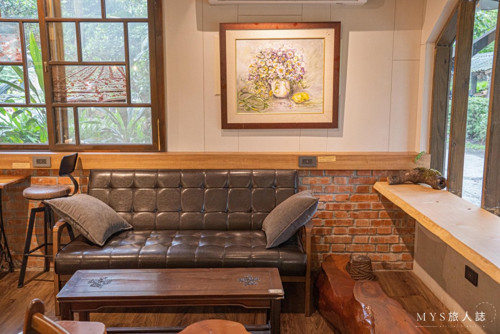 老樹舍咖啡廳室內也是呈現傳統木製裝潢,深色的木製桌椅反射暖黃的燈光,讓空間呈現高雅悠閒的氣息。